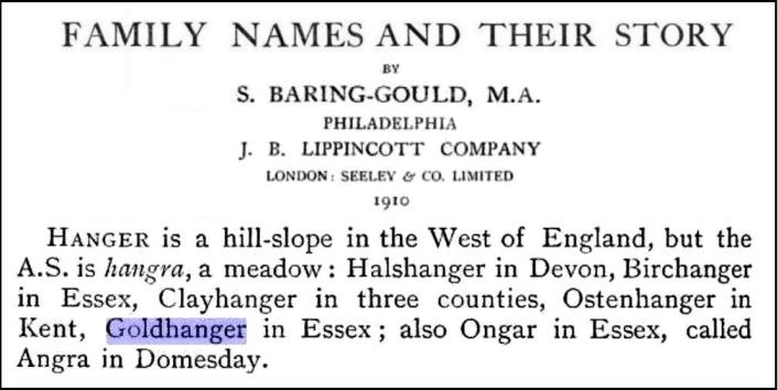 extract from a Beeleigh Abbey document of 1180 written in Latin shows the name spelt as: Goldhangre |